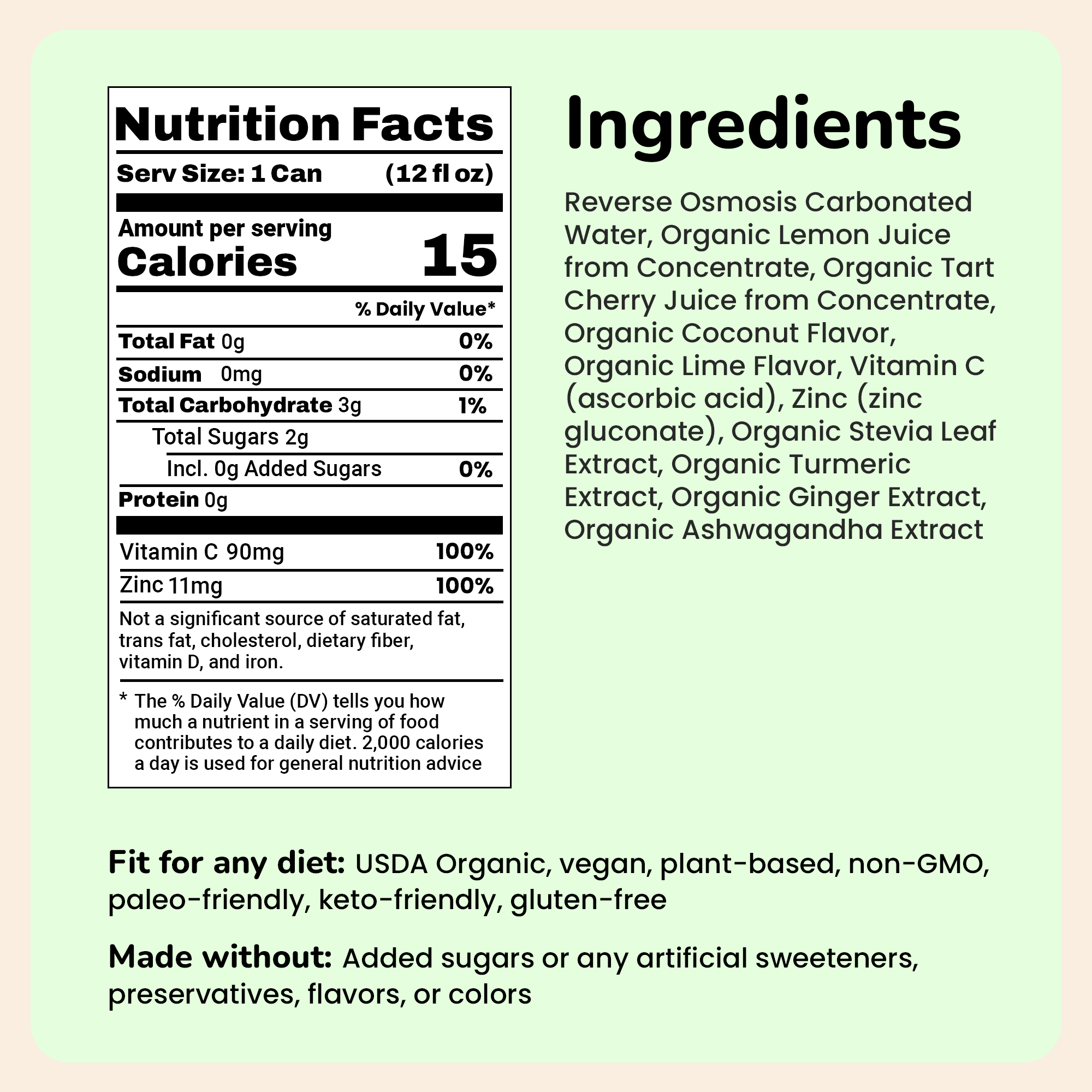 Reverse Osmosis Carbonated Water, Organic Lemon Juice From Concentrate, Organic Tart Cherry Juice From Concentrate, Organic Coconut Flavor, Organic Lime Flavor, Vitamin C (Ascorbic Acid), zinc (Zinc Gluconate), Organic Stevia Leaf Extract, Organic Turmeric Extract, Organic Ginger Extract, Organic Ashwagandha Extract